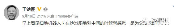 18年9月,王欣微博發(fā)了這樣一條,網(wǎng)友評論紛紛提出猜測王欣是否復(fù)出后的第一個(gè)戰(zhàn)場在掃地機(jī)器人行業(yè)。這似乎是場預(yù)見,18年10月,王欣的妻子彭鵬女士正式成為了歡創(chuàng)科技的第四大股東。