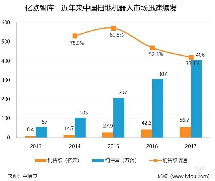根據(jù)中怡康數(shù)據(jù)顯示,2013-2017 年間中國掃地機(jī)器人銷售量及銷售額雙升,且維持高速增長,5 年內(nèi)實(shí)現(xiàn)了翻倍式發(fā)展。但相對于歐美,中國掃地機(jī)器人滲透率仍然較低,未來仍面臨廣闊的市場。